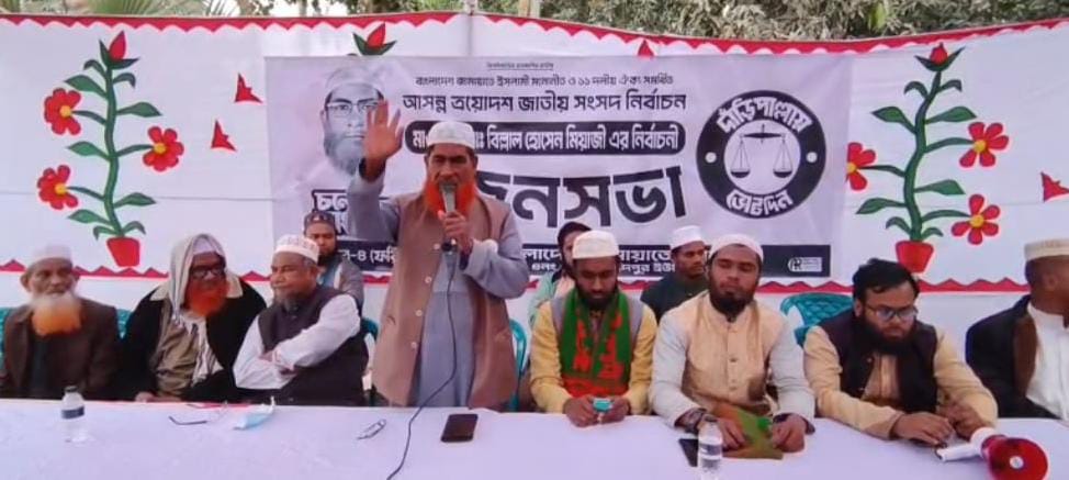 মোঃ ইয়াছিন পলোয়ান:আসন্ন জাতীয় সংসদ নির্বাচনকে সামনে রেখে চাঁদপুর-৪ (ফরিদগঞ্জ) আসনে ৪ নং সুবিদপুর পশ্চিম ইউনিয়নে বাংলাদেশ জামায়াতে ইসলামী মনোনীত ও ১১ দলীয় ঐক্য সমর্থিত সংসদ সদস্য প্রার্থী চাঁদপুর জেলা জামায়াতের আমির মাওলানা মো. বিল্লাল হোসেন মিয়াজীর নির্বাচনি জনসভা অনুষ্ঠিত হয়েছে।২ জানুয়ারী সোমবার বিকেলে ফরিদগঞ্জ উপজেলার ৪ নং সুবিদপুর পশ্চিম ইউনিয়নের শাহার বাজারে আয়োজিত জনসভায় প্রধান অতিথির বক্তব্য রাখেন মাওলানা মো. বিল্লাল হোসেন মিয়াজী। জনসভায় তিনি বলেন বাংলাদেশ জামায়াতে ইসলামী কোনো ক্ষমতার রাজনীতি করে না, আমরা মানুষের অধিকার ও ইনসাফের রাজনীতি করি। আমরা এমন একটি বাংলাদেশ গড়তে চাই, যেখানে গরিব-ধনী, কৃষক-শ্রমিক সবাই ন্যায়বিচার পাবে, কোনো মায়ের চোখে আর অশ্রু থাকবে না। আগামী জাতীয় সংসদ নির্বাচন শুধু একটি ভোট নয়, এটি দেশ গড়ার একটি সুযোগ। আমি আপনাদের প্রতি আহ্বান জানাই ভয়ভীতি ও লোভ উপেক্ষা করে সত্য ও ন্যায়ের পক্ষে দাঁড়ান। দাঁড়িপাল্লা প্রতীক ইনসাফ, সততা ও ভারসাম্যের প্রতীক। আসুন, আমরা সবাই মিলে একসাথে ন্যায়ভিত্তিক একটি বাংলাদেশ গড়ি , দুর্নীতিমুক্ত ও শান্তির বাংলাদেশ।জনসভায় আরো উপস্থিত ছিলেন ফরিদগঞ্জ উপজেলা জামায়াতের আমির মাওলানা ইউনুস হেলাল,চাঁদপুর শহর শাখার সাধারণ সম্পাদক শেখ বেলায়েত হোসেন, চাঁদপুর জেলা ইসলামি ছাত্রশিবিরের সাধারণ সম্পাদক হাছিবুল ইসলাম সহ বাংলাদেশ জামায়াতে ইসলামী ও সহযোগী সংগঠনের বিভিন্ন স্তরের নেতাকর্মীসহ স্থানীয় গণ্যমান্য ব্যক্তিবর্গ উপস্থিত ছিলেন।জনসভায় উপস্থিত সাধারণ ভোটারদের সঙ্গে কথা বললে তারা একটি সুষ্ঠু ও শান্তিপূর্ণ নির্বাচনের প্রত্যাশা ব্যক্ত করেন। গোবিন্দপুর ইউনিয়নের এক ভোটার বলেন, আমরা চাই সৎ যোগ্য একজন জনপ্রতিনিধি, যিনি এলাকার মানুষের কথা সংসদে তুলে ধরবেন।জনসভায় স্থানীয় জনগণের স্বতঃস্ফূর্ত উপস্থিতি লক্ষ্য করা যায়।